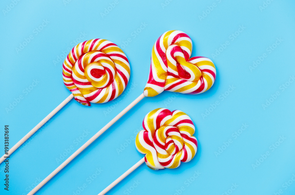 Three large lollipops on a stick in the shape of a circle, a flower and a heart on a blue background, handmade