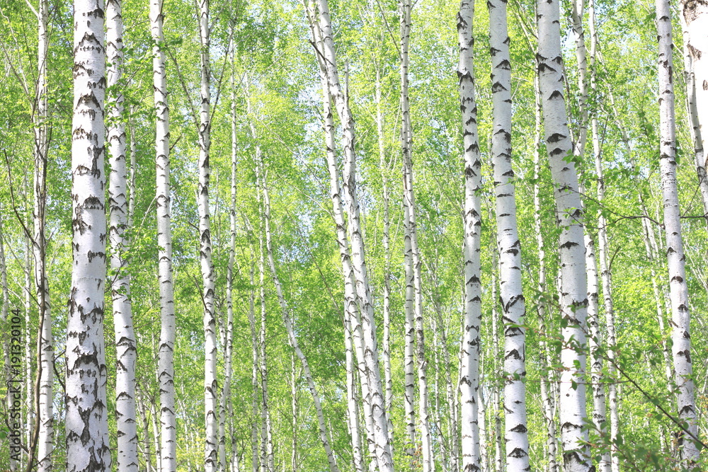 Beautiful young birch trees with green leaves in summer in sunny weather