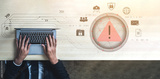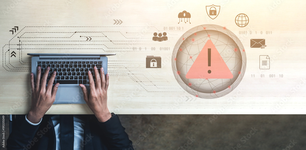 Red warning triangle representing a cybersecurity threat or data breach alert, surrounded by digital security and network protection icons, symbolizing cyber risk awareness Parse