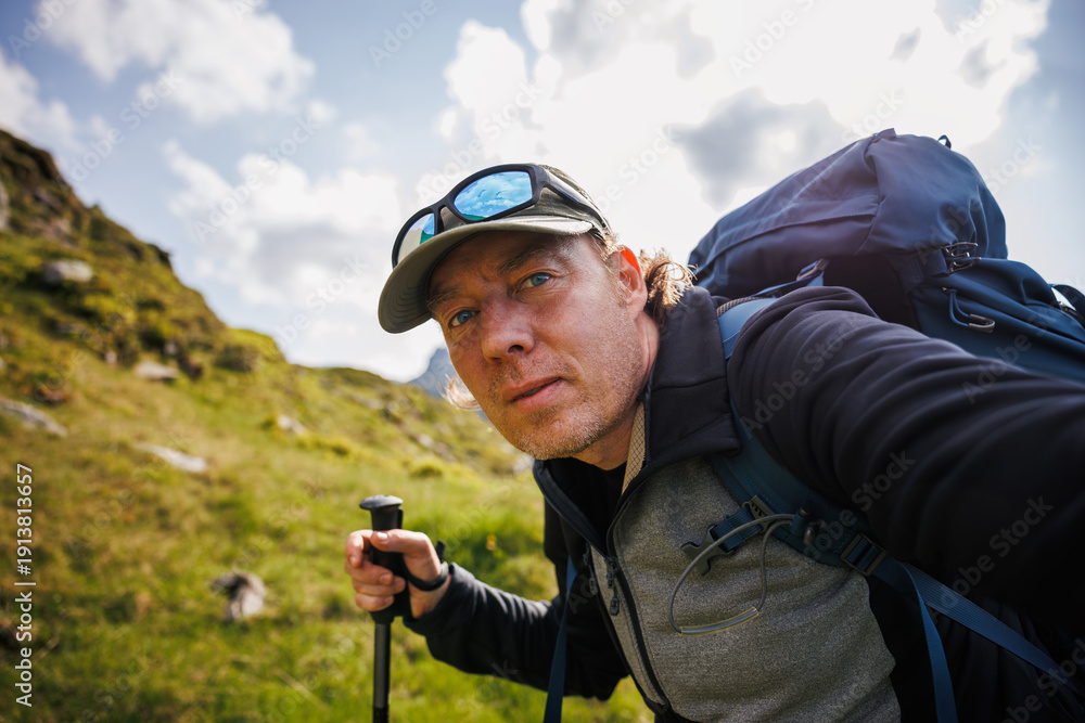Hiker with backpack taking selfie on smartphone while trekking in mountains in Styria, European Alps, Austria. Outdoors adventure lifestyle