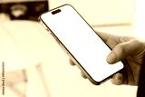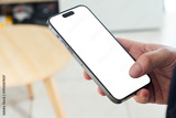 Person holding smartphone mockup with transparent screen PNG in blurred office lifestyle setting, concept of business productivity