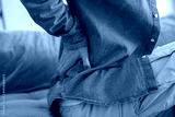 Upset tired young man feeling pain massaging stiff back rubbing tensed muscles to relieve back ache joint shoulder discomfort after long sedentary work in incorrect posture, fibromyalgia concept