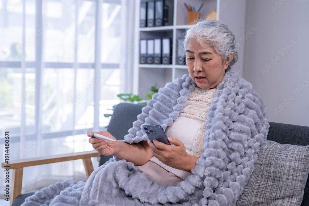 Elderly woman measuring temperature using smartphone for telehealth