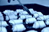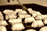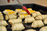 Coating mixed egg yolk on rolls . Making domestic rolls with cheese