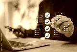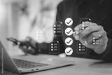 Businessman is digitally checking off a list of tasks or documents on a virtual screen, symbolizing successful completion, efficient business management, quality control.