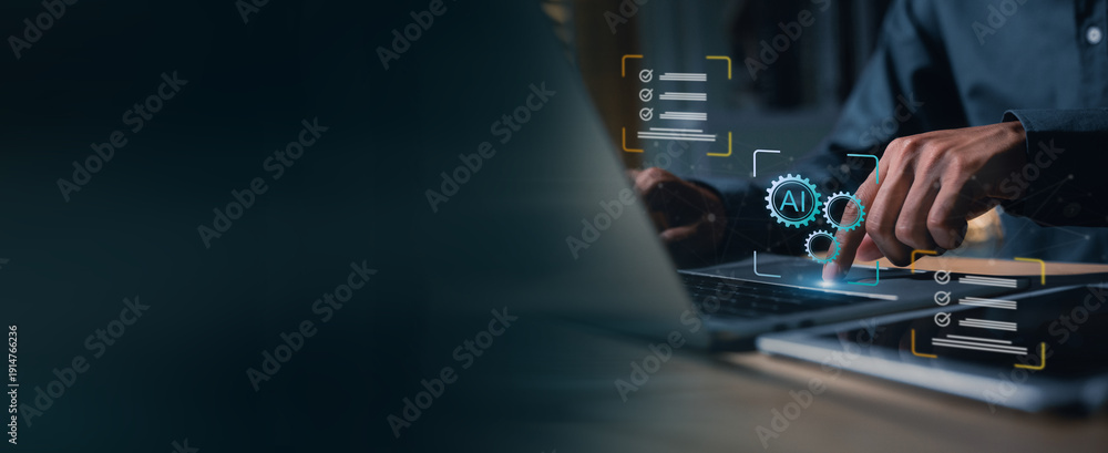 business working with a data processing system on a laptop, with graphics showing gears and AI, emphasizing Digital Transformation and the use of advanced technology in corporations.