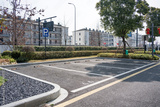 Empty urban residential parking lot surrounded by greenery and modern buildings on a clear day