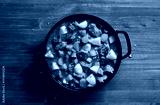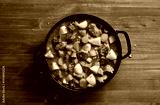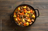 Beef stew with potato, carrot, onion, herbs in cast iron pan