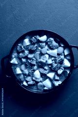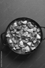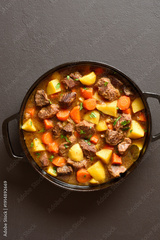Delicious beef stew with potato, carrot, onion, herbs in cast iron pan