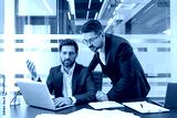Two professional businessmen are collaborating and discussing business strategy, working together on a laptop during an informal meeting in a contemporary office setting