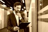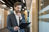 Confident businessman in a formal suit intently reviewing documents on a clipboard, standing in a modern office hallway, reflecting on business strategy and important decisions
