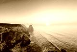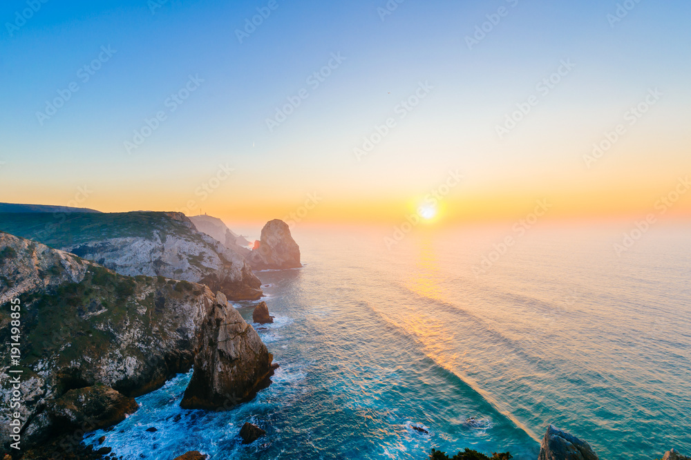 Amazing stunning unbelievable sunset at atlantic ocean in Portugal. Cape Rock fantasy seascape. View from big height at colorful scenic sea with rocks and mountains in evening. Tropical paradise.