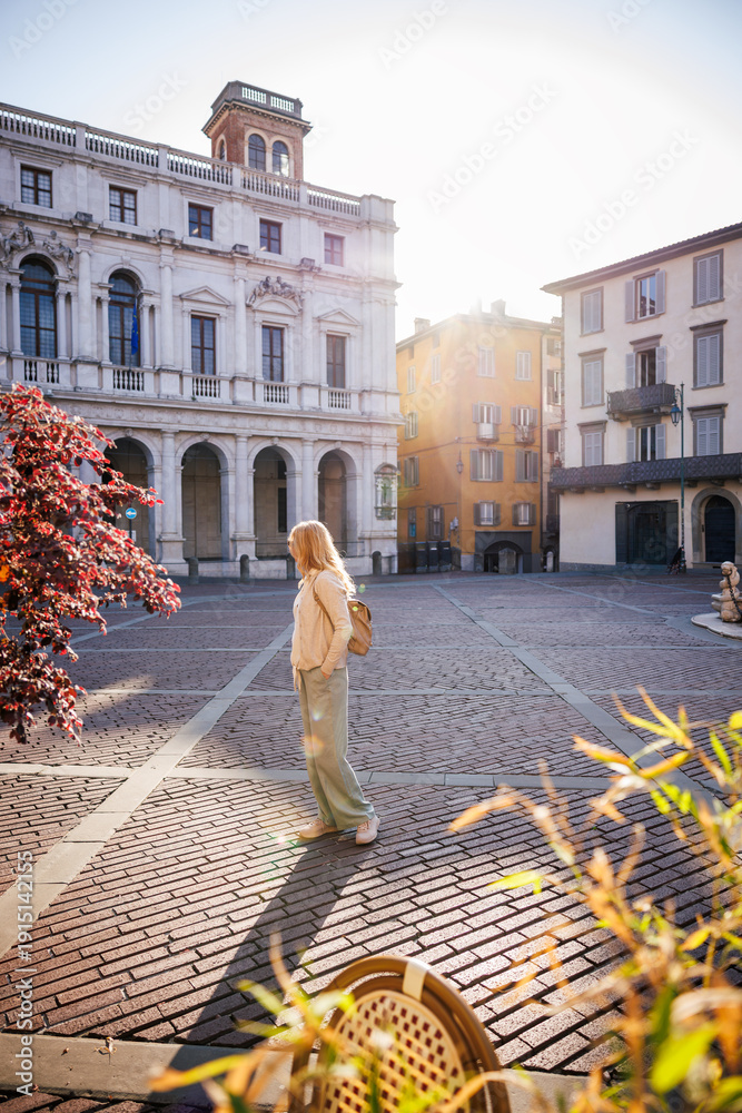 Woman traveler enjoying peaceful morning atmosphere on Piazza Vecchia town square in Bergamo, Italy during summer holiday. Solo travel vacation