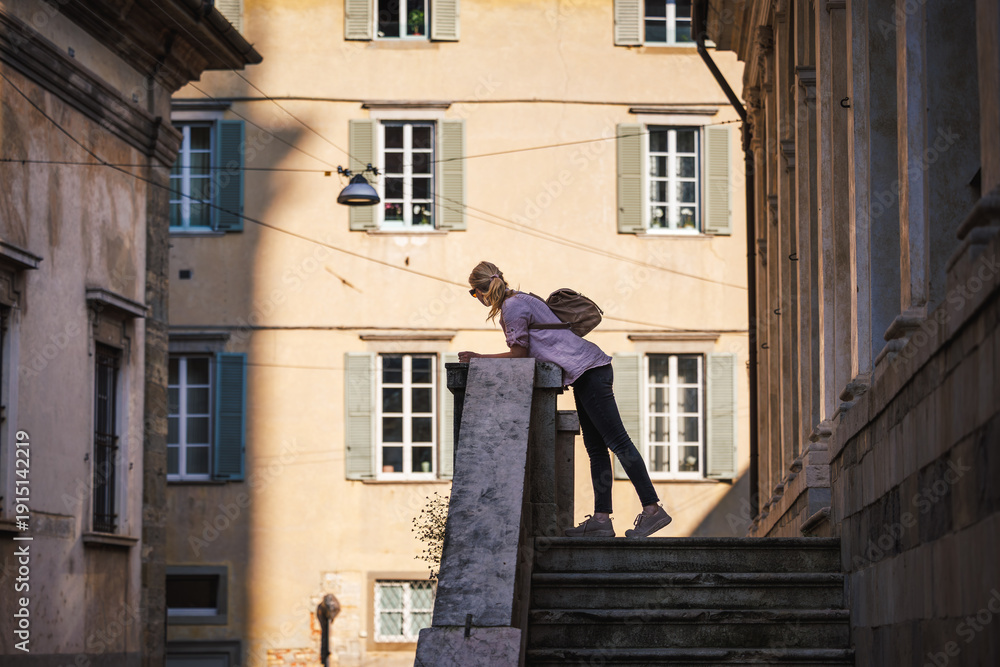 Woman tourist exploring streets and architecture of upper town Citta Alta, Bergamo in Italy. Solo travel vacation in Europe