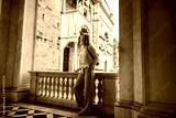 Woman tourist exploring medieval architecture of Basilica di Santa Maria Maggiore in Citta Alta Bergamo, Italy. City break in Europe