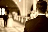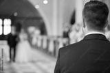 Brautvater übergibt Bräutigam Braut in Kirche bei Hochzeit