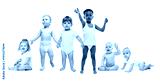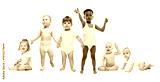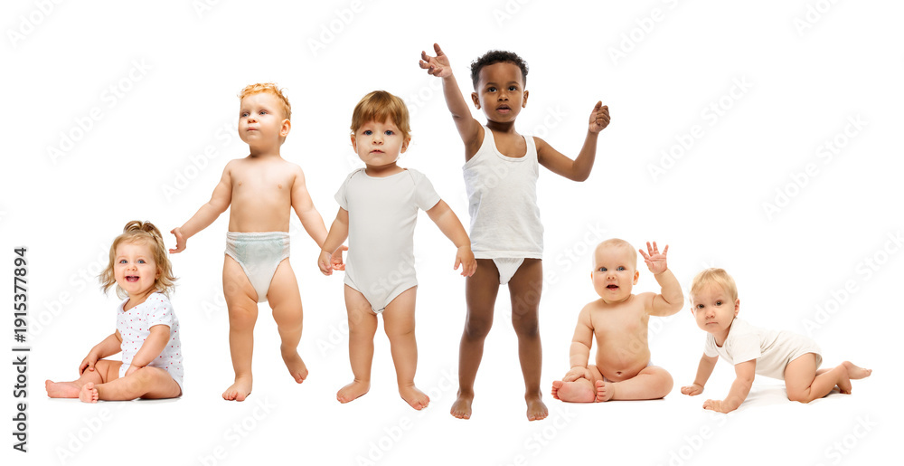 Baby development collage with diverse infants standing sitting and crawling on white. Concept of early childhood growth, inclusivity, parenting resources, pediatric care and baby product advertising.