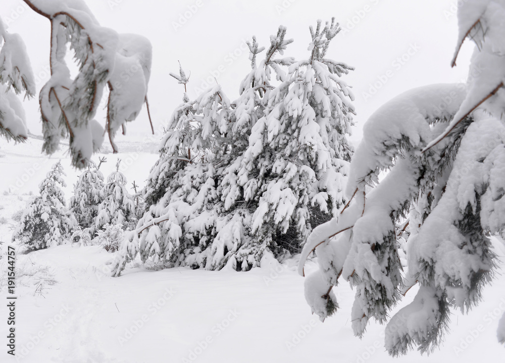 Trees covered snow. Christmas trees covered with white snow. Frozen spruce tree branch in winter forest.