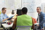 Middle aged Caucasian men and Black man discussing project details in office, foreman wearing safety vest sitting with colleagues near construction plans and safety helmet on table