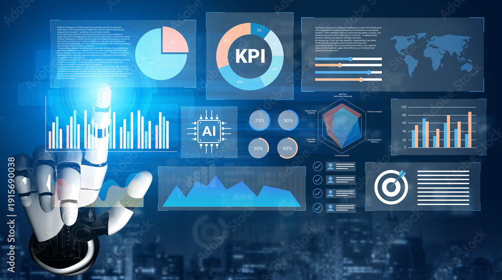 A futuristic robot hand interacts with a digital user interface filled with various data analytics, charts, KPIs, and visual representations showcasing modern technology. Gantry