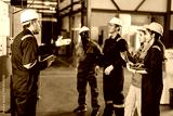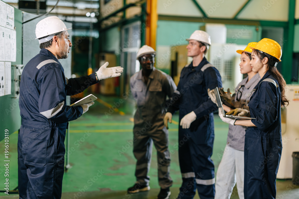 Professional senior lead supervisor engineer man training young engineer team in industry factory