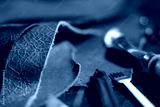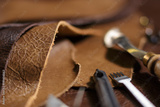 Crafting tools on natural cow leather in the tailoring workshop. Close up