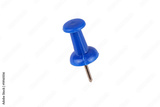 Macro of blue push pin over white background