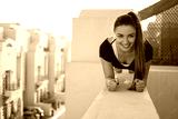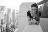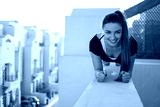 Smiling young beautiful woman in sportswear doing plank while standing on wall at rooftop.