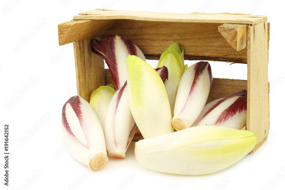mixed fresh yellow and red chicory in a wooden crate on a white background