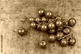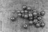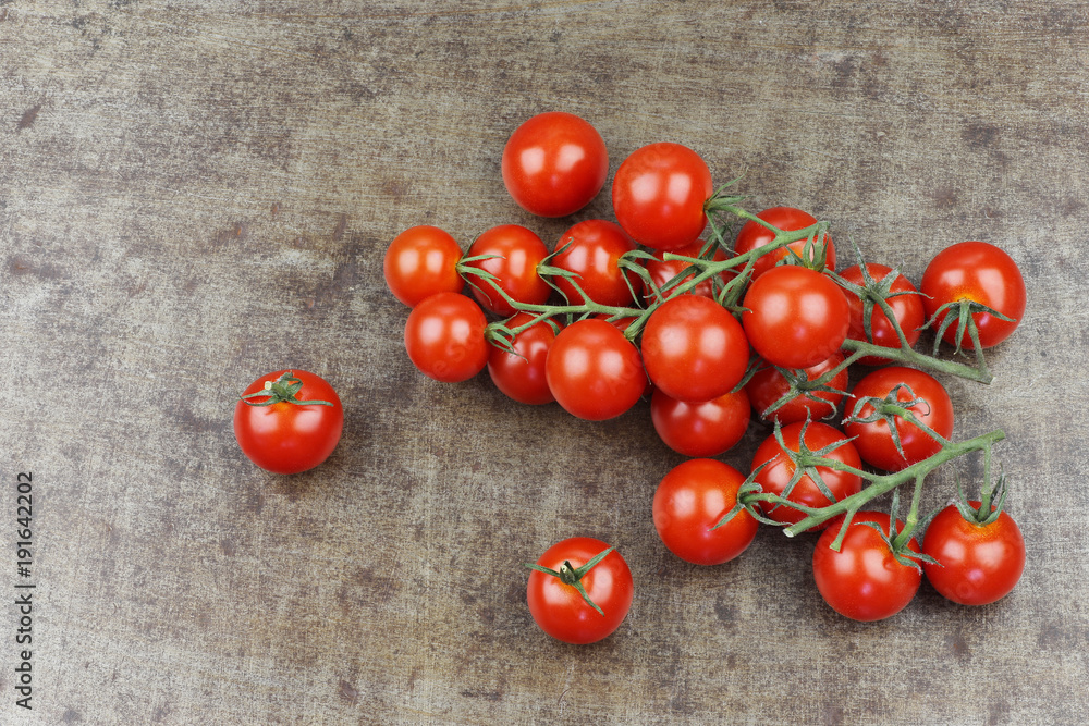 fresh tomatoes and cherry tomatoes on the vine on a grungy metal background