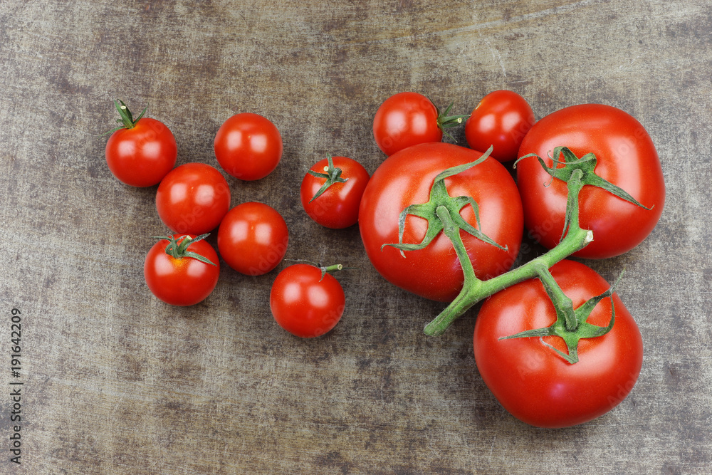 fresh tomatoes and cherry tomatoes on the vine on a grungy metal background