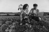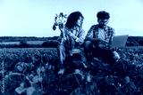 Agronomists analyzing soybean plants and using laptop in cultivated field