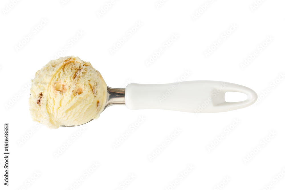 Ball of vanilla ice cream with nuts and caramel in scoop