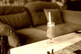 Orange beverage with straw on wooden coffee table in living room setting