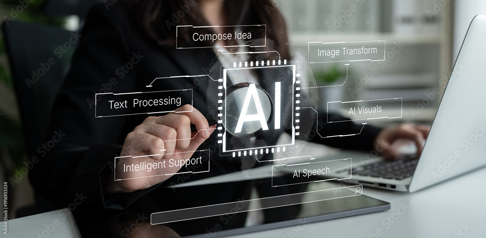 Artificial intelligence capability map showing text processing, speech, visual transformation and intelligent support in one system. Corpus