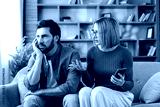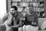 Upset man and an emotional woman are having a marital conflict at home, communicating about problems in their relationship while she holds a mobile phone