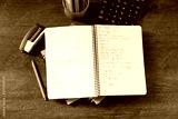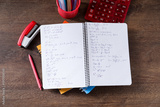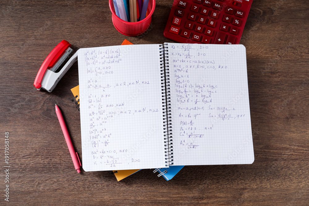 Homework. Notebook with math formulas and different stationery on wooden table, flat lay