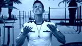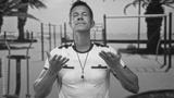 Man with palms up gesture and whistle necklace in gymnasium by outdoor calisthenics bars; calm focus.