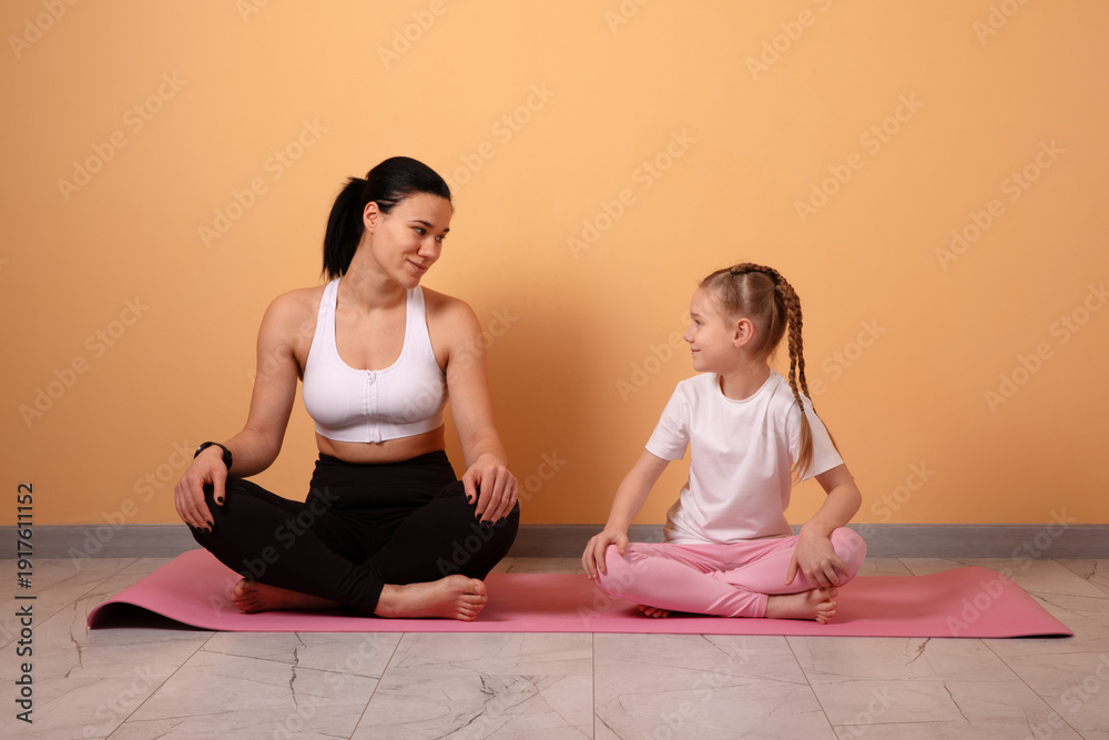 Smiling mother and daughter practicing yoga together on a pink mat, indoors, against a peach background. Healthy lifestyle, family fitness, and bonding concept.