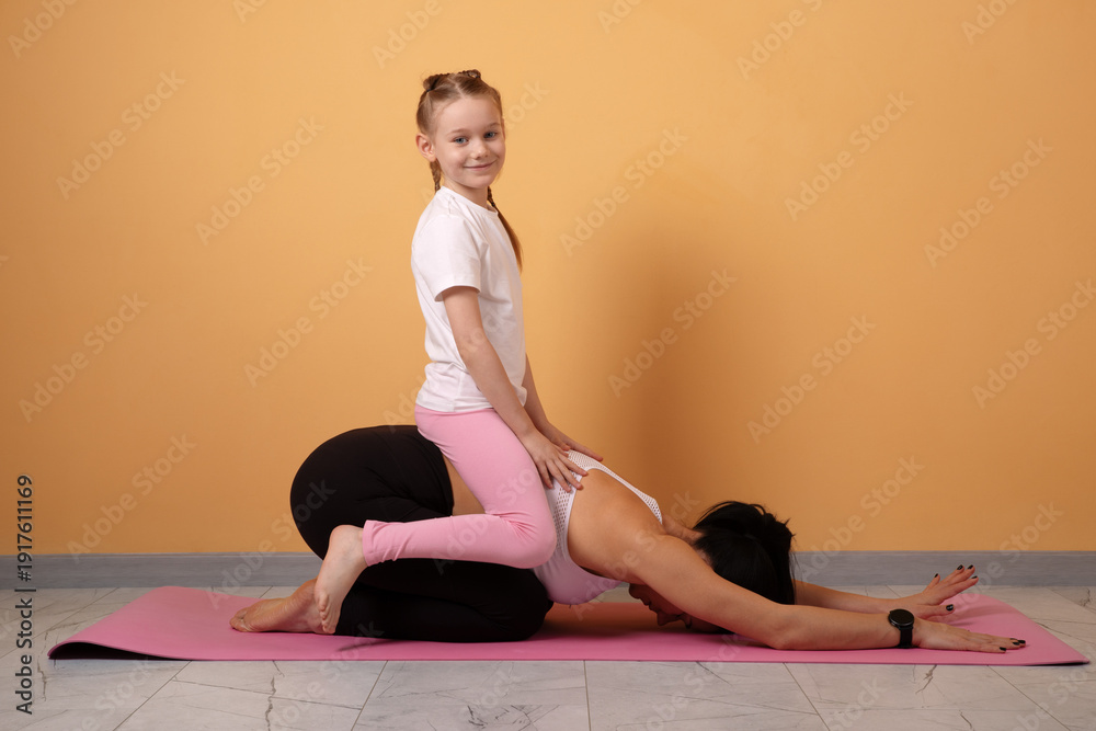 Smiling young girl and mother practicing partner yoga on a pink mat against a warm orange background, promoting wellness and family bonding.