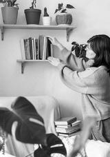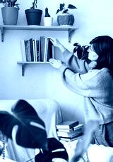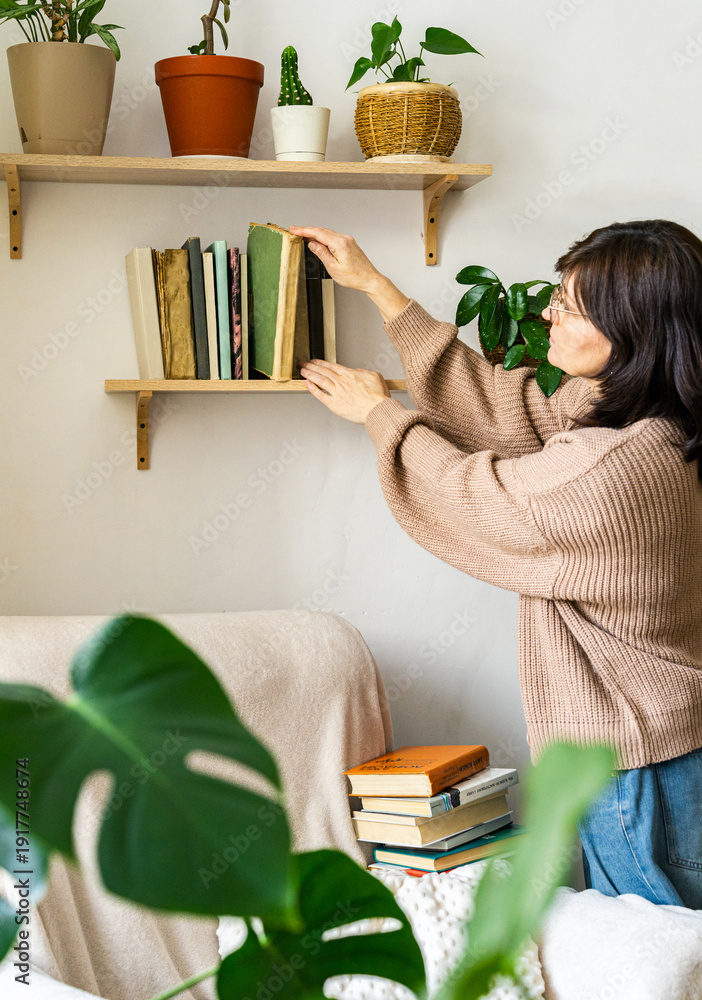 Woman organizing old books on wooden shelf