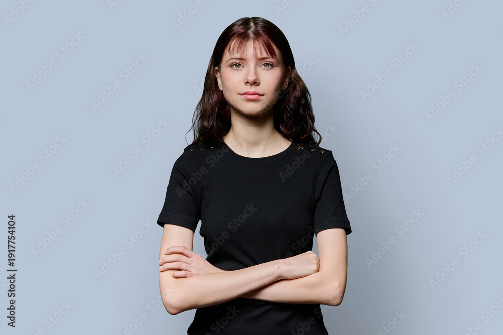 Portrait of smiling confident teenage girl with crossed arms on gray background