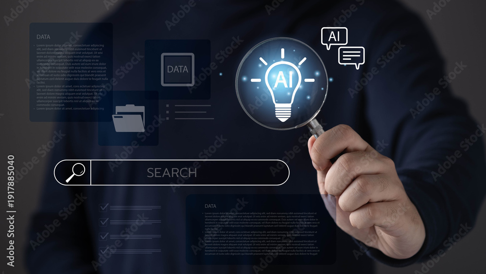 Business professional holding magnifying glass AI light bulb icon with search interface, artificial intelligence innovation, data discovery, smart technology, automation, digital business solutions.