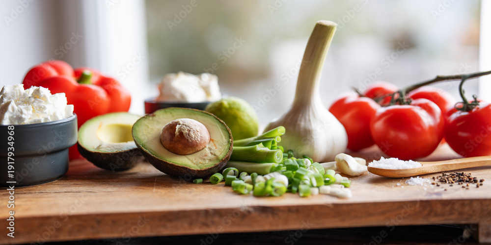 Different fresh vegetables on a wooden cutting board. Close-up of a kitchen scene with healthy ingredients for salads and dips.