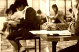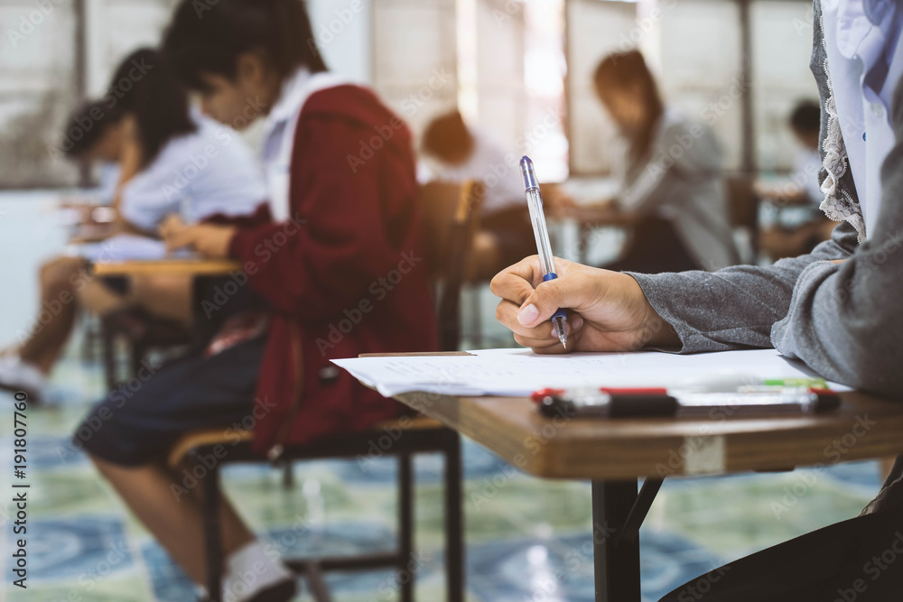 Close up to hand of student holding pen and taking exam in classroom with stress for education test.