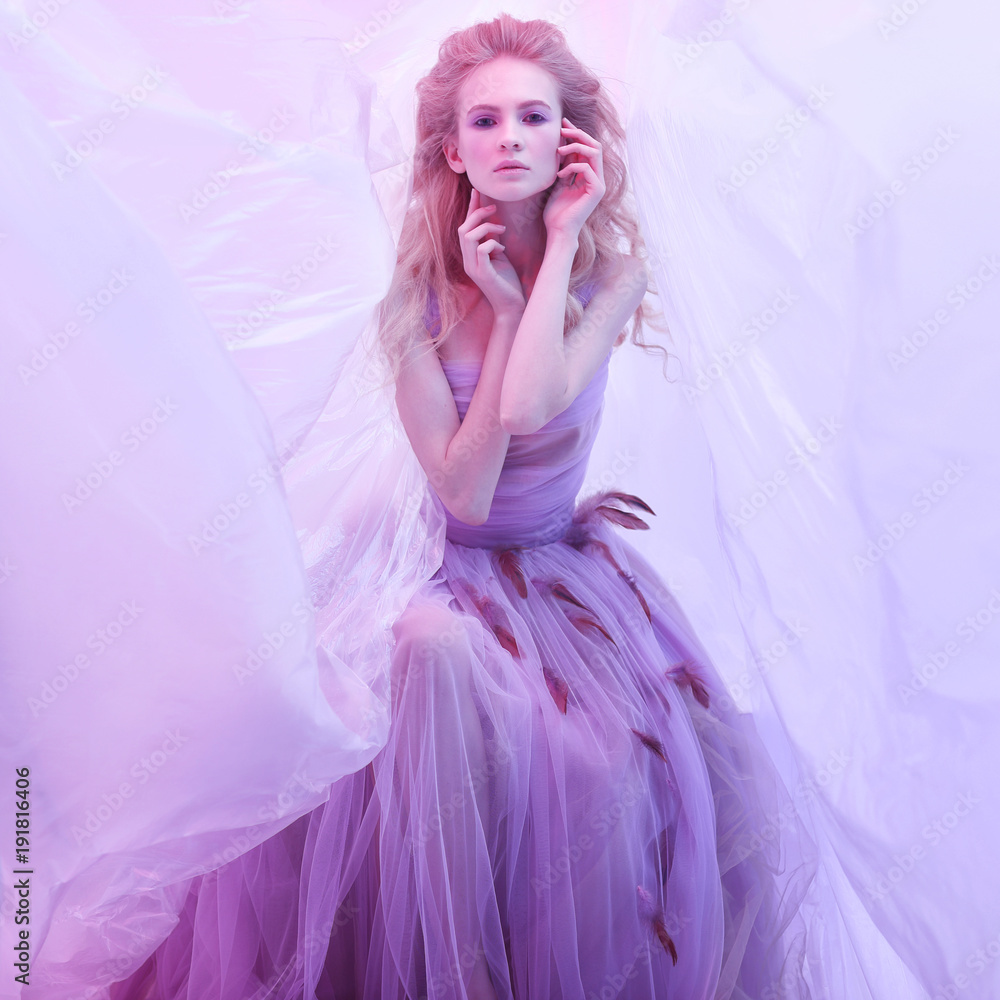 Fashion portrait of young beautiful woman in fluffy violet dress.