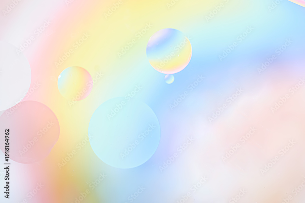 Horizontal macro shot of glossy translucent bubbles in iridescent pastel rainbow hues pink, blue, yellow, green floating over soft gradient background