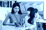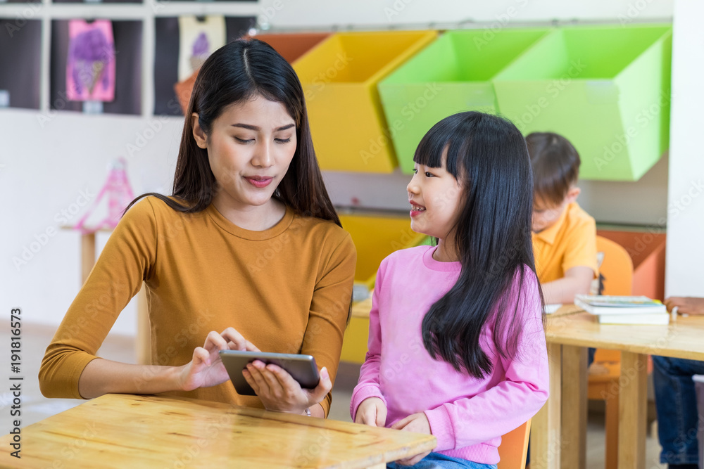Asia woman teacher teach girl student with tablet computer in classroom at kindergarten preschool,Online education concept.