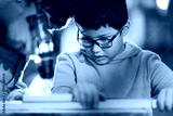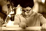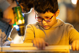 Young boy learning woodworking skills with adult