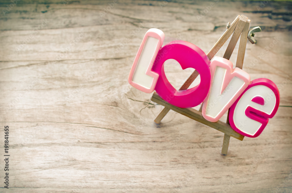 Decorative inscription Love on a small wooden easel that stands in vintage board